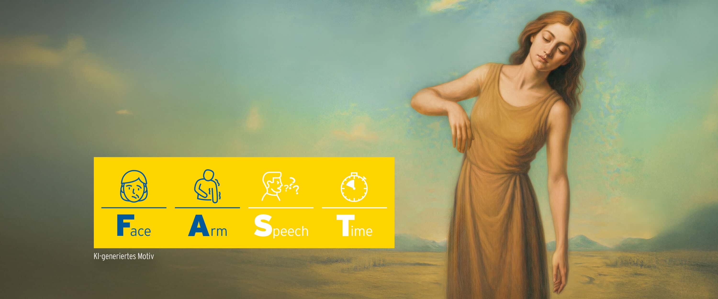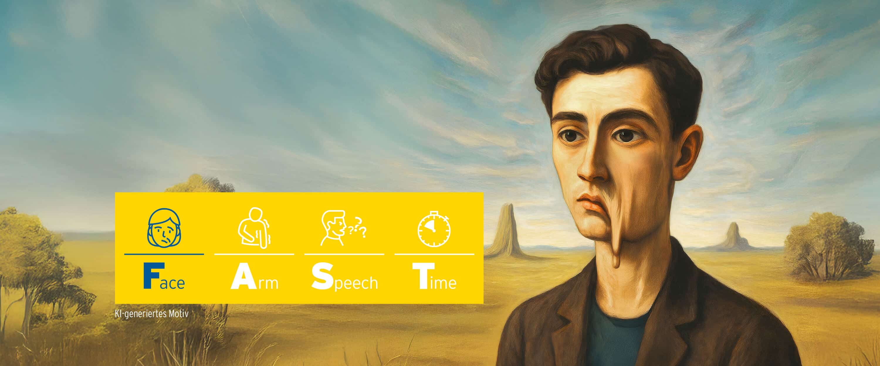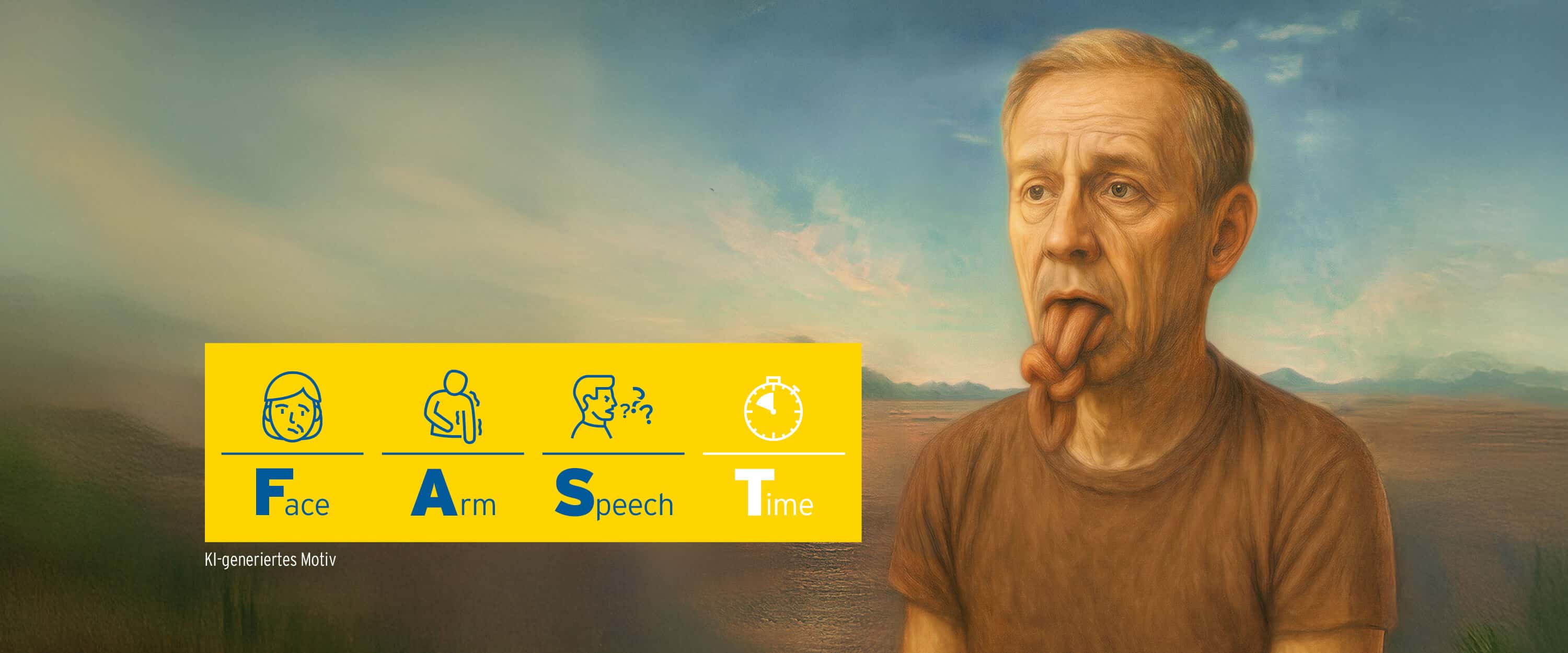 Mit dem FAST-Test kann man den Verdacht auf einen Schlaganfall sofort überprüfen. Der Test stammt aus dem englischsprachigen Raum: FAST bedeutet nicht nur schnell, sondern in diesem Fall steht F für „Face“ (Gesicht), A für „Arm“, S für „Speech“ (Sprache) und T für „Time“ (Zeit).